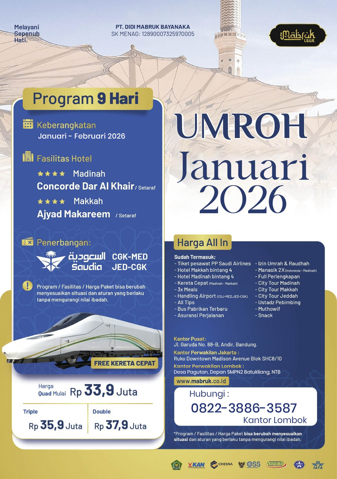 • Kami memahami bahwa perjalanan umroh bukan sekadar wisata, melainkan sebuah panggilan suci yang mendalam. Oleh karena itu, Mabruk Tour & Travel hadir dengan komitmen untuk memberikan pelayanan terbaik, memastikan setiap langkah ibadah Anda berjalan dengan aman, nyaman, dan penuh kekhusyukan.